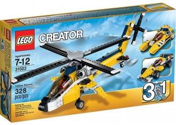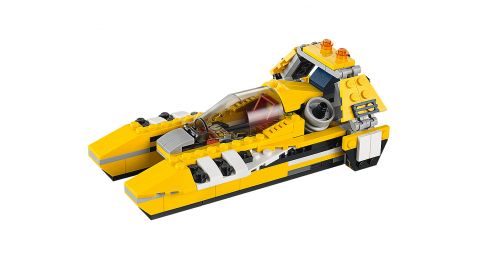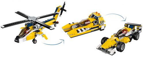Hold on tight! Take the 3-in-1 Yellow Racers helicopter for a thrilling ride. This awesome machine has a powerful, chunky main rotor, sleek cockpit and retractable front landing gear. Taxi to the helipad using its multidirectional tail wheel. Skim over the terrain at breakneck speed! Then land and rebuild it into a speedy race car or an ultra-fast speedboat.